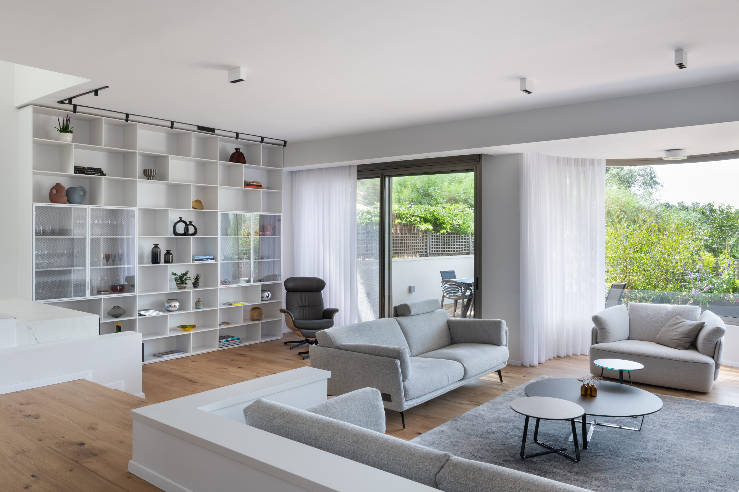 החלון העגול הקיים בסלון קיבל התייחסות ומעבר לתכנון תאורה מוקפד נבחרה ספה עגולה גם כן המסתובבת 360 מעלות ומאפשרת צפיה אל החצר האחורית של הבית.